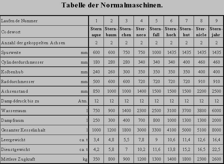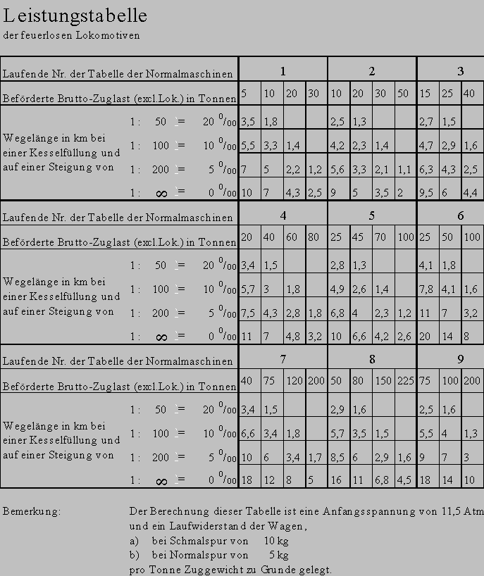 bezeichnet, wobei damals auch eine Baureihe der gefeuerten Tenderlokomotiven mit "S" begann. Die Leistungsmerkmale können der "Tabelle der Normalmaschinen" sowie der "Leistungstabelle der feuerlosen Lokomotiven" entnommen werden.