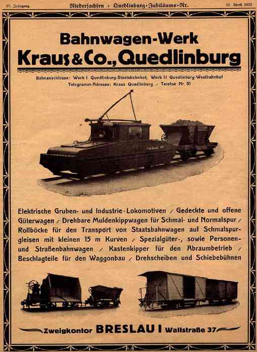 Das "Bahnwagenwerk Kraus & Co." in Quedlinburg wurde 1912 gegründet. Gebaut werden der mechanische Teil von elektrischen (Gruben-) Lokomotiven, die den elektrischen Teil von Siemens erhalten. Bekannt sind vor allem Exportlieferungen (u.a. Peru, Frankreich, Südafrika, Chile), die allerdings mit Ausbruch des Ersten Weltkrieg 1914 abrupt enden. Nach dem Ersten Weltkrieg scheint es eine Zusammenarbeit mit der Bergmann Elektricitäts Unternehmung AG (BEW) gegeben zu haben. Der Schwerpunkt lag da aber schon bei der Fertigung von Güterwagen, Rollböcken, Spezialgüter-, Personen- und Strassenbahnwagen. Laut einer Anzeige wurden auch Drehscheiben und Schiebebühnen angeboten.