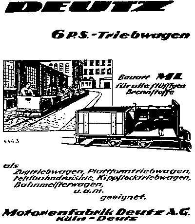 Als erstes wird der Typ "M" verwendet, ein liegender Einzylinder-Viertaktmotor. Bei den ML-Motoren handelt es sich um eine Weiterentwicklung des MK-Motors, der neben dem bereits oben genannten Typ E zum Einsatz kam. Wie der Typ MAH sind dies liegende Viertaktmotoren mit einem Zylinder, die ab Mitte der 1920er Jahre hauptsächlich mit Dieselkraftstoff betrieben wurden. Mit dem Typ "MAH" stellt Deutz erstmals ein Typenbauprogramm für Grubenlokomotiven auf, der Typ MAH914 wird noch bis zur Einstellung des Lokomotivbaus 1969 gebaut, während man die "ML"-Typen nur bis in die 1940er Jahre hinein als Lokmotor verwendet.